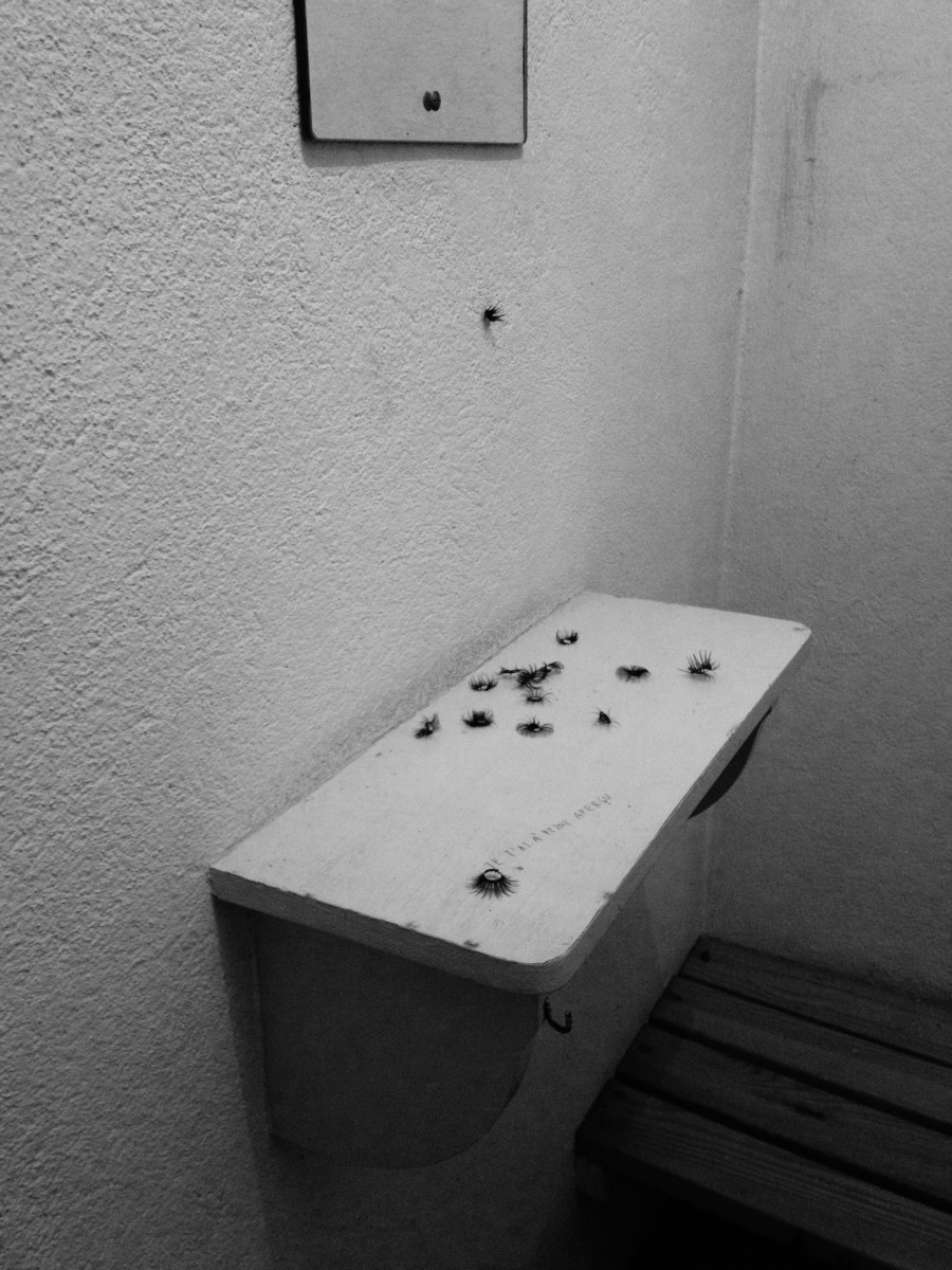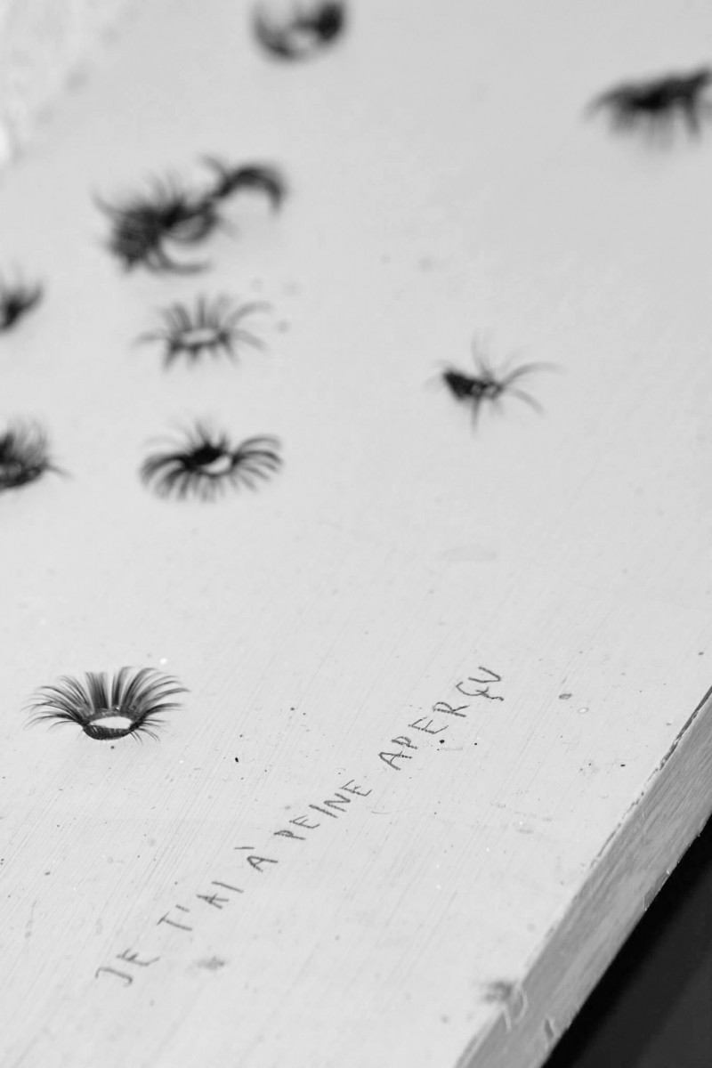 Die Tusche prägt sich auf den Vliessstoff ein. Die Bilder, die während des Tages gesehen wurden, lösen sich in ihrer Überlagerung auf. Zurück bleibt die weisse Fläche und die letzte Sequenz, die Spur der Wimpern.