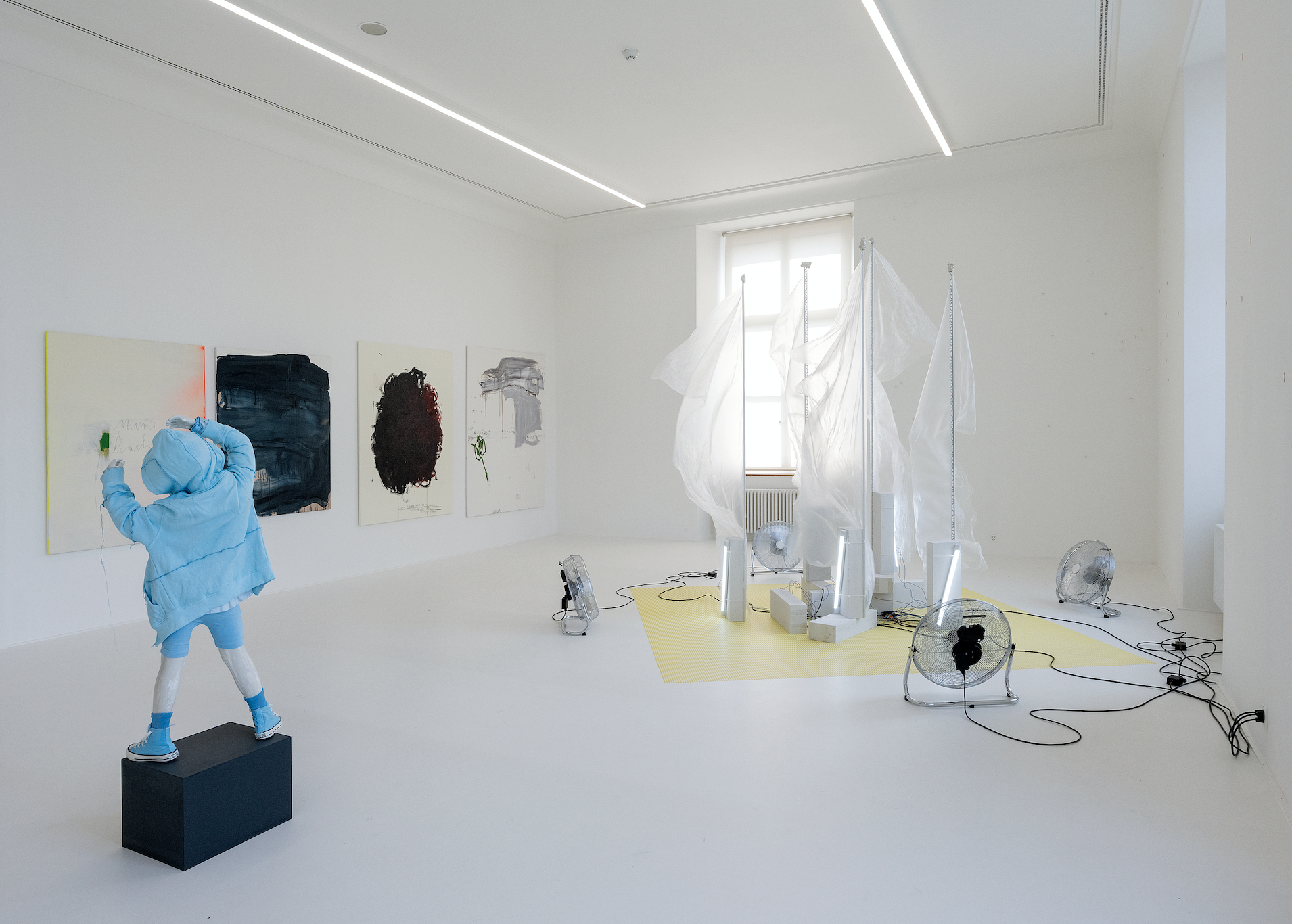 Die Tusche prägt sich auf den Vliessstoff ein. Die Bilder, die während des Tages gesehen wurden, lösen sich in ihrer Überlagerung auf. Zurück bleibt die weisse Fläche und die letzte Sequenz, die Spur der Wimpern.