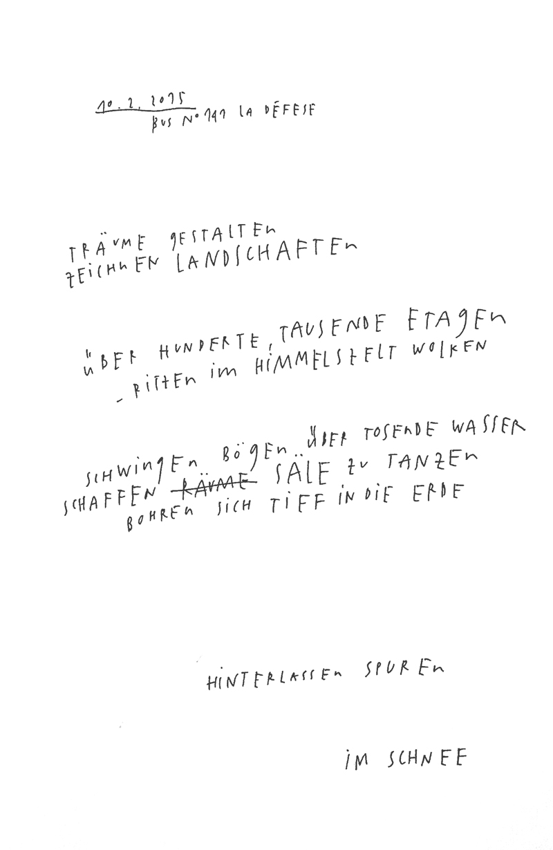 Die Tusche prägt sich auf den Vliessstoff ein. Die Bilder, die während des Tages gesehen wurden, lösen sich in ihrer Überlagerung auf. Zurück bleibt die weisse Fläche und die letzte Sequenz, die Spur der Wimpern.