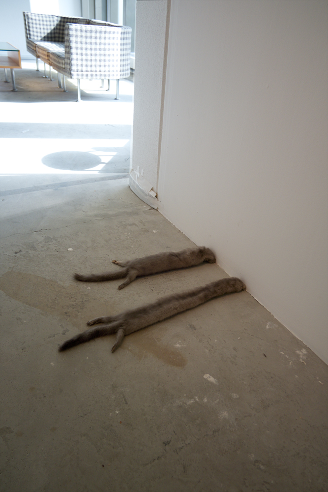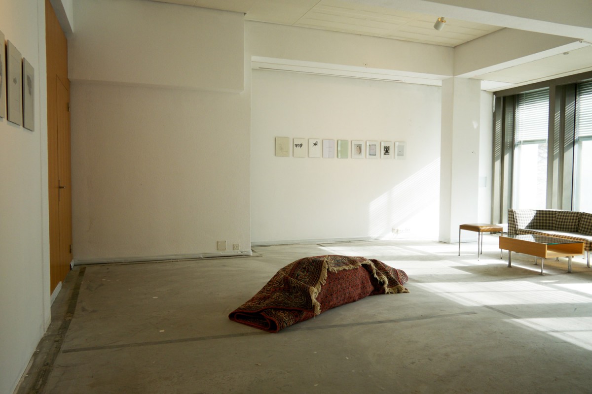 Die Tusche prägt sich auf den Vliessstoff ein. Die Bilder, die während des Tages gesehen wurden, lösen sich in ihrer Überlagerung auf. Zurück bleibt die weisse Fläche und die letzte Sequenz, die Spur der Wimpern.
